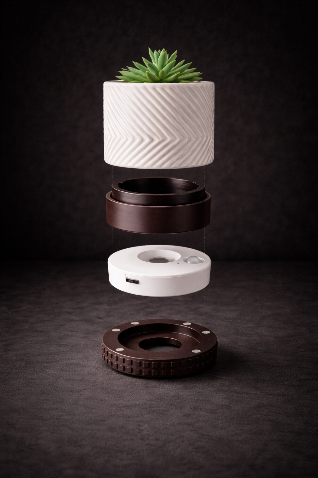 Debajo se integra un depósito de agua de 3,5 cm de altura, manteniendo el mismo diámetro para conservar la armonía visual. En su parte superior incluye una rosca funcional, que además actúa como reserva adicional de agua.